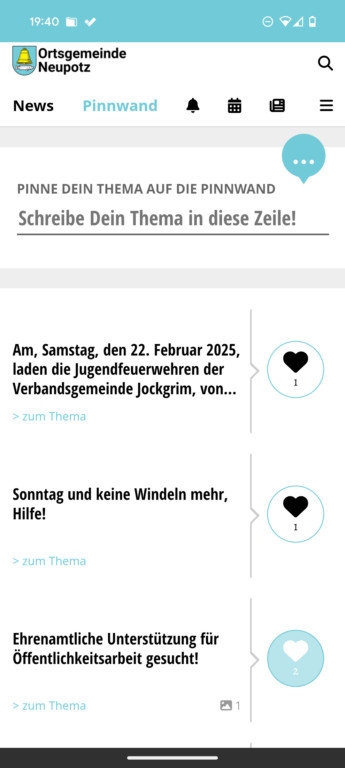 ba1ad6fa-0ba0-49b3-8d4c-d02e877e4d6dHier seid ihr gefragt! Jede/Jeder kann hier mit Fragen und Ideen auf einen Schlag die gesamte Gemeinde erreichen und Hilfe anbieten, Unterstützung und Rat erfragen sowie miteinander interagieren. Ihr wollt euch eine Taschenlampe ausborgen, wisst aber nicht, wen ihr fragen könnt? Ab auf die Pinnwand damit! Ihr habt einen streunenden Hund entdeckt? Foto machen und ab auf die Pinnwand damit! Die Möglichkeiten sind vielfältig und auch uns noch nicht ansatzweise alle bekannt, also fühlt euch herzlich eingeladen mitzumachen.